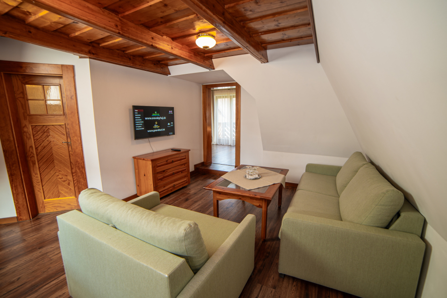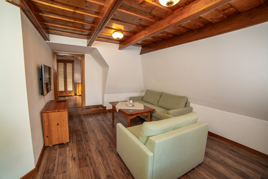 Priestranné apartmány sú navrhnuté pre našich hostí tak, aby im priblížili vidiecku kultúru a návrat k prírode, ale poskytli luxus a komfort, na ktorý sú zvyknutí. Disponujú dvomi pevnými lôžkami s komfortnými matracmi, ktoré si nechávame zhotovovať na mieru. Do týchto apartmánov je možné umiestniť až dve prístelky. Navyše majú oddelenú spálňovú a obývaciu časť s krbom, samozrejmosťou je vybavenie samostatnou kúpeľňou s WC, TV a ďalším vybavením.